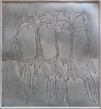 Líneas en relieve galvanizadas sobre plancha de cobre. 19,5 x 18,5 cm. Impresión con rodillo.