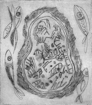 Grabado electrolítico sobre plancha de cobre. 11 x 9,5 cm. Líneas sobre barniz duro.